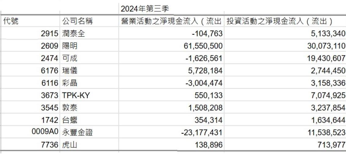 根據公開資訊觀測站數據顯示,前三季的現金流量表中的投資活動進帳金額排名,可成、永豐金證分別以119億元和111億元排第二、第三名,排第一名陽明海運就算買了二十幾艘船,導致投資活動現金流出,但最後仍是淨現金流入,前3季進帳300.73億元。