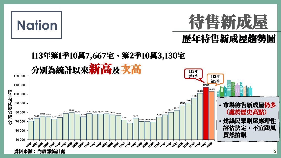 內政部今日(19日)於部務會報中公布「113年上半年低度用電住宅及待售新成屋概況」,顯示全國待售新成屋量持續攀升,113年第1季達到10萬7,667宅,創統計以來新高,113年第2季雖稍微減少至10萬3,130宅,仍為次高紀錄。此外,低度使用住宅比率上升至9.32%,其中以台南市在六都中增幅最大,達0.32個百分點。