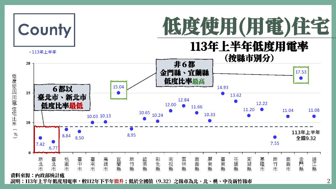 此外,根據統計,低度使用住宅比率最低的縣市為台北市(6.77%),其次為新北市(7.42%);比率最高的縣市為金門縣(17.53%)和宜蘭縣(15.04%)。