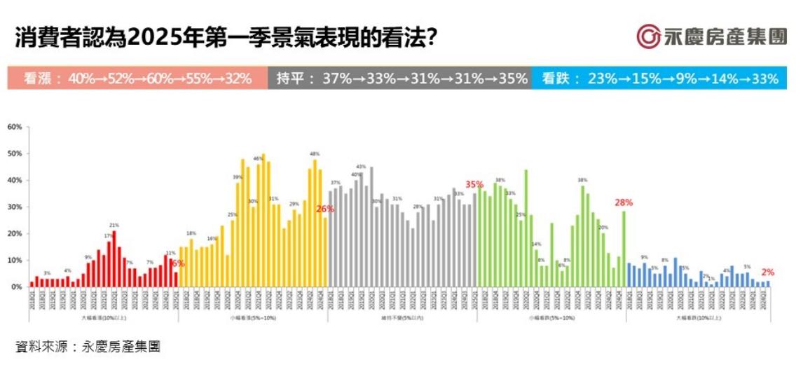 根據永慶房屋2025年第一季網路會員調查,全台認為房價看漲的比例由上季的55%大幅下降,本季為32%,較上季大減23個百分點,而看跌比例則增至33%,看跌比例超越看漲。永慶房屋業管部協理陳賜傑指出,自今年7、8月開始銀行房貸緊縮,加上9月央行祭出第七波選擇性信用管制,已逐漸扭轉消費者對房價持續上漲的預期,看漲比例大幅下降,而看跌比例則大增19個百分點至33%,看跌比例超越看漲,顯示消費者對於房價看法已呈現多空交叉,房價看法反轉。