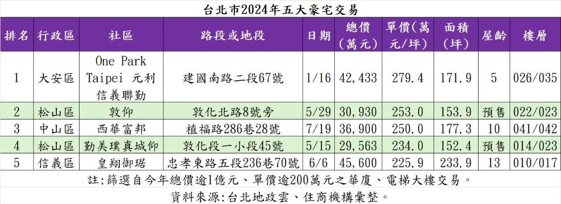 另可觀察此次北市五大豪宅中,也有兩處預售案進榜,賴志昶補充,此2案皆位處松山區,該區近年來商業與生活機能發展成熟,又有「文華苑」、「潤泰敦峰」等頗具名氣的成屋豪宅屢創高價,令區域預售新案開價能較有底氣:此外,預售豪宅除有屋齡更新穎等優勢,又由於交屋期較長,在限貸氛圍之下,對現金流壓力不會較大,因此讓不少預售豪宅也受高端客戶青睞。