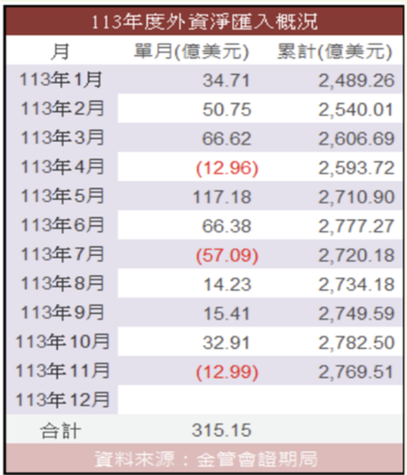 受美元指數2024年走升,全年上漲7.2%,台幣匯率同期間貶值6.72%,外資全年賣超台股上市股票高達6952億。但據金管會證期局資料,外資累計2024年前11月外資淨匯入合計仍達315.15億美元,折合台幣約1.002兆億台幣,顯示外資2024年前11月匯入的資金,大部分尚未投入台灣股市,外資甚至加碼賣出持股。