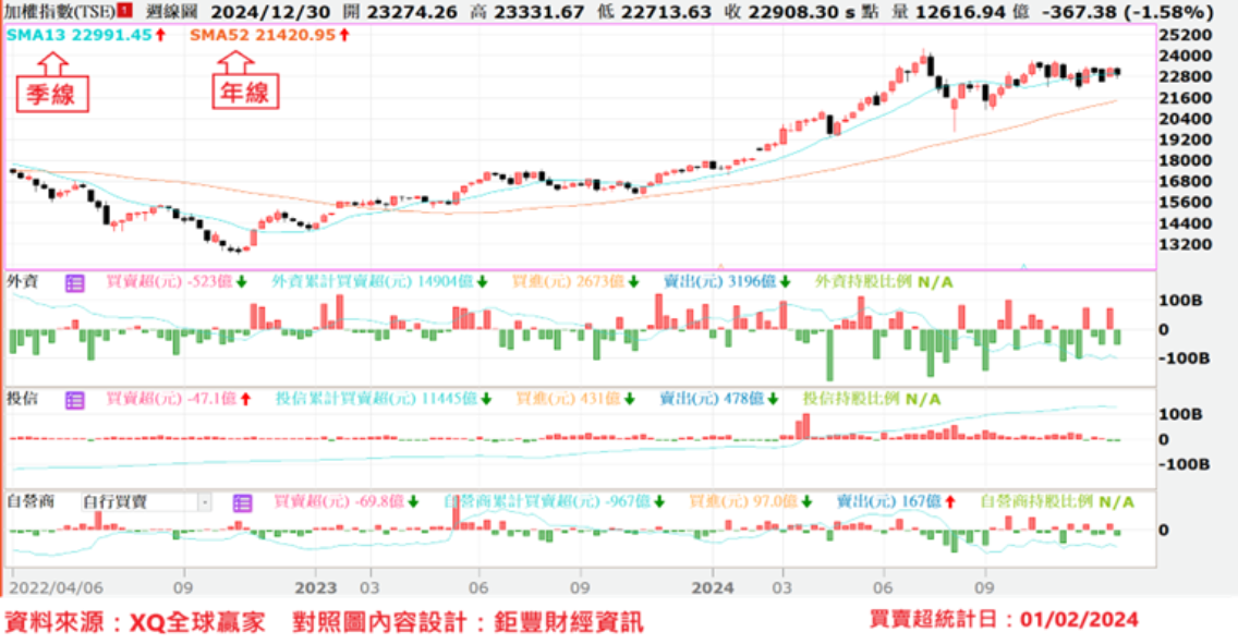 2024年國內投信對市場的主導力量已超過外資,最主要原因來自持續回流的本土資金,推高國內貨幣供給額總計數,持續呈現滿溢狀態,加上近期國內房市降溫,資金面仍有利台股2025年延續多頭行情。