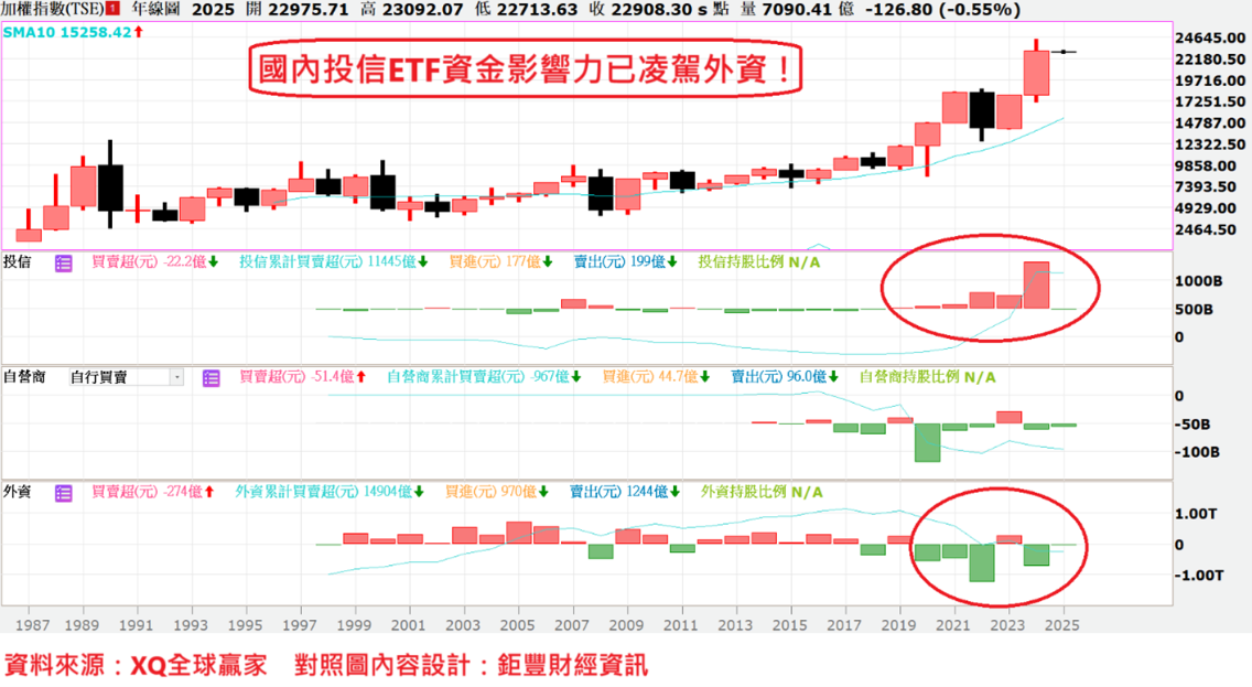 相較於外資2024年賣超台股上市股票6952億,本土法人投信公司合計買超8321億,與外資形成強烈對比。國內投信公司自2022年起,連續三年買超台股金額均超過兩千億以上,三年合計達1.35兆台幣,同期間,外資過去三年則累計賣超1.75兆台幣,然台股指數過去兩年連續上漲,2024年指數甚至續創歷史新高。由此可見,本土法人資金對台股指數的影響力,早已不在外資之下。