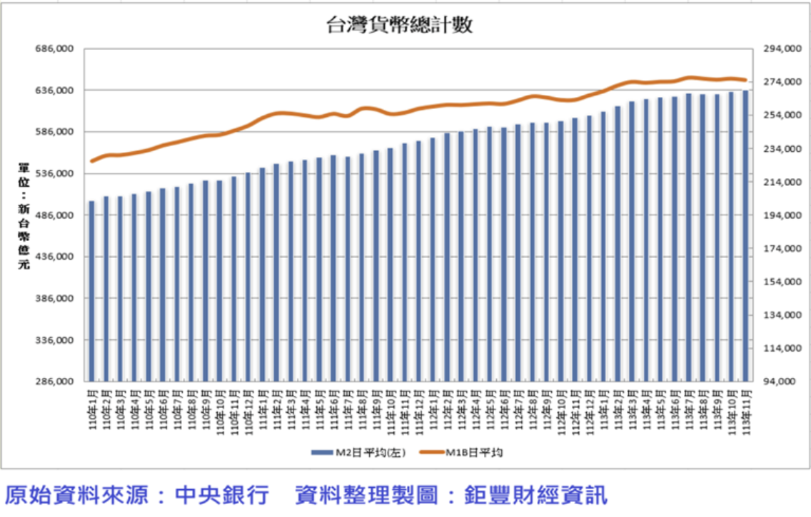 11月國內貨幣供給額M1B日平均總計數27.5143兆(日平均),月減0.31%,年增4.56%,距7月歷史新高,僅回落0.5%,仍在歷史最高檔附近,顯示流動性資金仍十分充沛;M2總計數63.5937兆,月增0.33%、年增5.47%,10月、11月連續2個月再創歷史新高。無論廣義貨幣供給額的M2總計數、或是代表高度流動性的狹義貨幣供給額M1B,均顯示國內整體資金水位仍在歷史最高檔區,整體資金仍相當充沛。