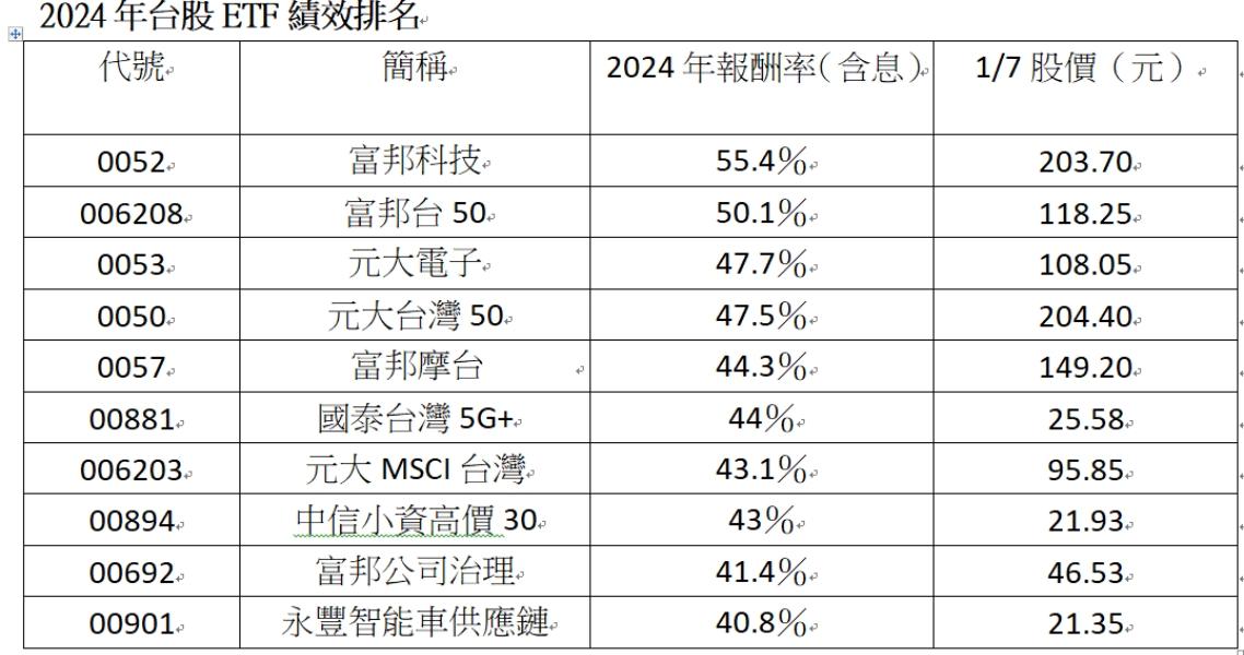從台股ETF的全年績效來看,檢視2024年報酬率(含息)表現,其中,富邦科技(0052)以55.4%居冠、其次富邦台50(006208)則同樣超過5成,而元大電子(0053)報酬率達47.7%則位居第三名;至於最老牌ETF的元大台灣50(0050)報酬率以47.5%緊追在後,第五名則是富邦摩台(0057),報酬率也同樣超過44%。