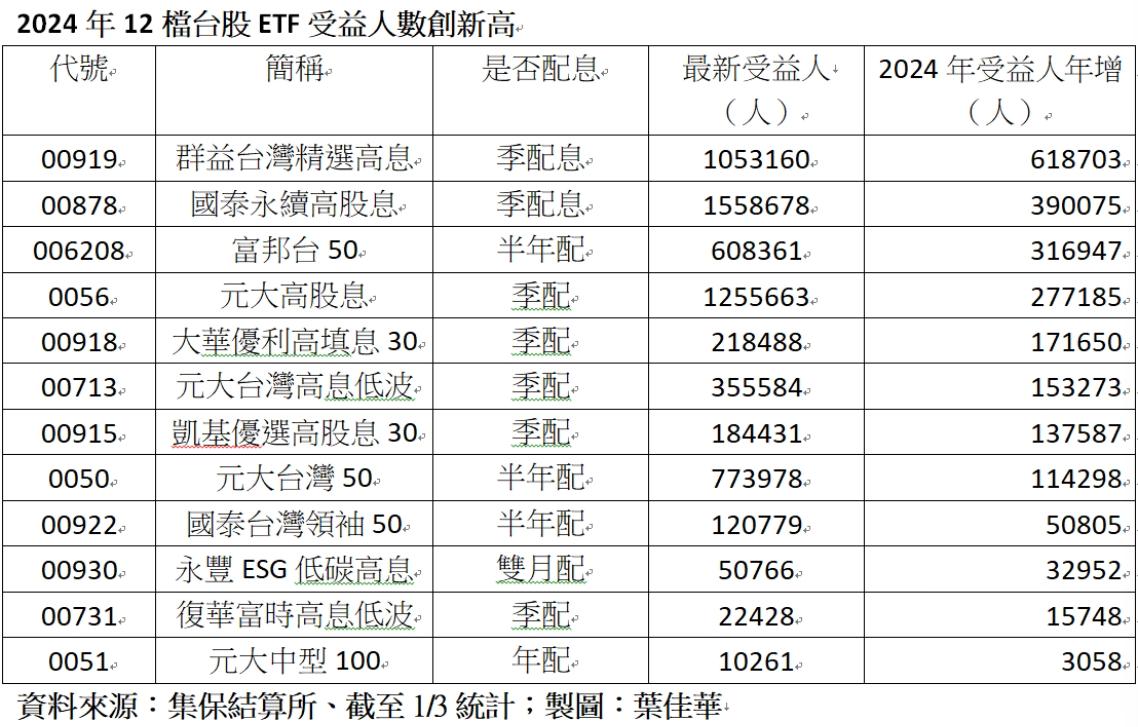 其中有8檔是高息型進榜,顯示高股息ETF還是深受投資人青睞;若以2024年度受益人表現來看,群益台灣精選高息(00919)去年一整年增加61.8萬人的受益人數居冠,成為台股ETF去年度的人氣王;國泰永續高股息(00878)年增近40萬人居次、第三名則是富邦台50(006208)受益人也大增逾30萬人。
