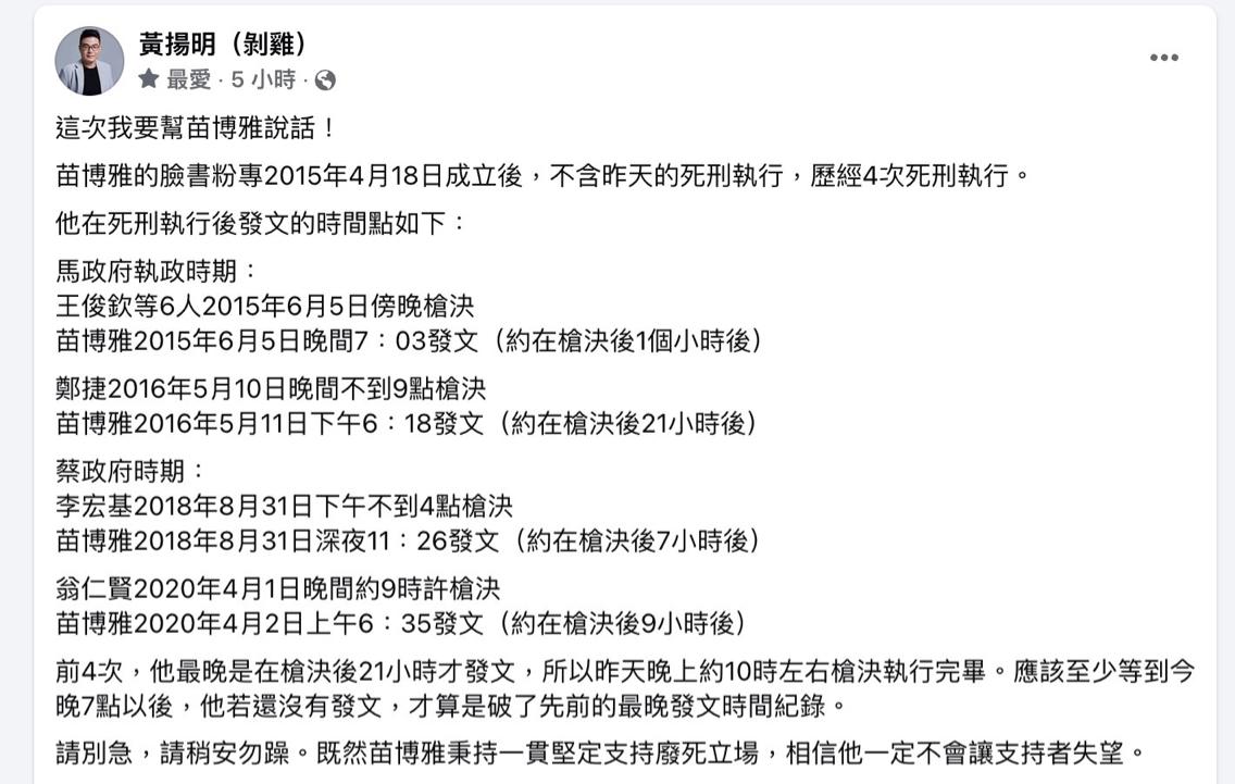 資深媒體人黃揚明今也在臉書發文要大家稍安勿躁。黃揚明表示,苗博雅的臉書粉專2015年4月18日成立後,不含昨天的死刑執行,歷經4次死刑執行。他統計苗博雅在之前死刑執行後發文的時間點,要大家應該至少等到今晚7點以後,若還沒有發文,才算是破了先前的最晚發文時間紀錄。
