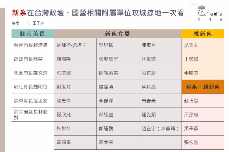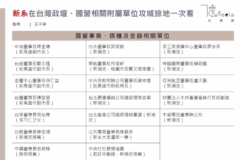 而在國營事業、媒體及金融相關單位,去年520民進黨重新拿回執政權,新系在國營事業以及金融、媒體相關單位也是大豐收,包括這次出包的中油董事長陳金德、台船董事長鄭文隆、金屬中心林仁益、台鹽董事長陳啟昱、台苯董事長吳怡青、台水董事長郭俊銘、華航董事長何煖軒、台北農產運銷公司總經理吳音寧、中央社社長張瑞昌等,一共有17人都是新系人馬。