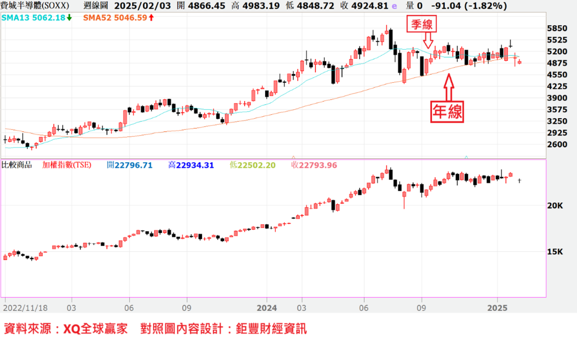 與台股指數走勢高度相關的美國費城半導體指數元月最後一周下跌6.1%,加上川普聲稱考慮將自2月18日對半導體晶片開徵進口關稅,為2月首周台股指數下跌的主因。從周K線觀察,費城半導體指數年線(52周均線)依舊維持上揚的多頭趨勢,但季線(13周均線)呈現小幅度下滑,且指數同步跌落季、年線之下,中期氣勢出現轉弱危機。