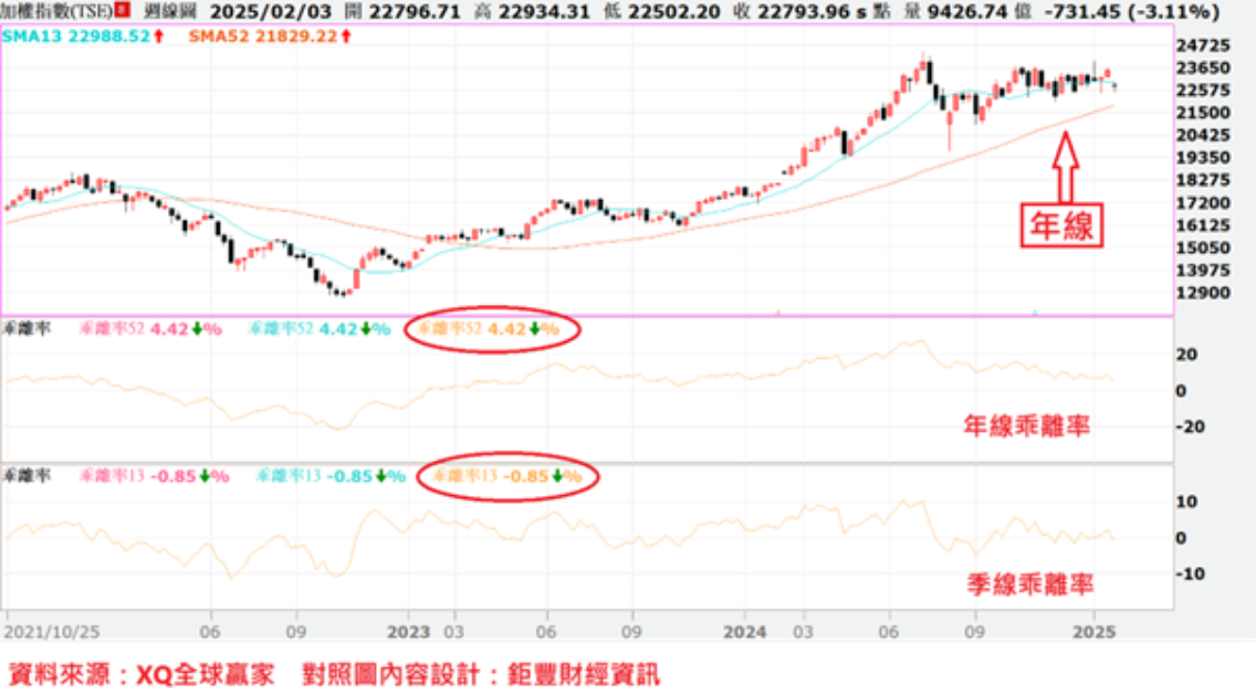 與費城半導體指數2025年初以來下跌1.11%相較,台股指數截至2月4日,下跌1.05%,兩者下跌幅度相當接近。但從台股周K線觀察,台股指數自2024年7月自歷史最高點24416點拉回整理以來,從未跌落年線以下,年線保持穩定上揚的多頭趨勢,指數從歷史最高點,拉回幅度為6.6%,遠低於費城半導體指數拉回幅度的17%,顯示台股指數韌性高於費城半導體指數,從中、長期趨勢線觀察,多頭架構尚未因中期回檔整理而遭到改變。