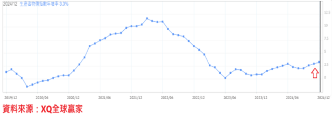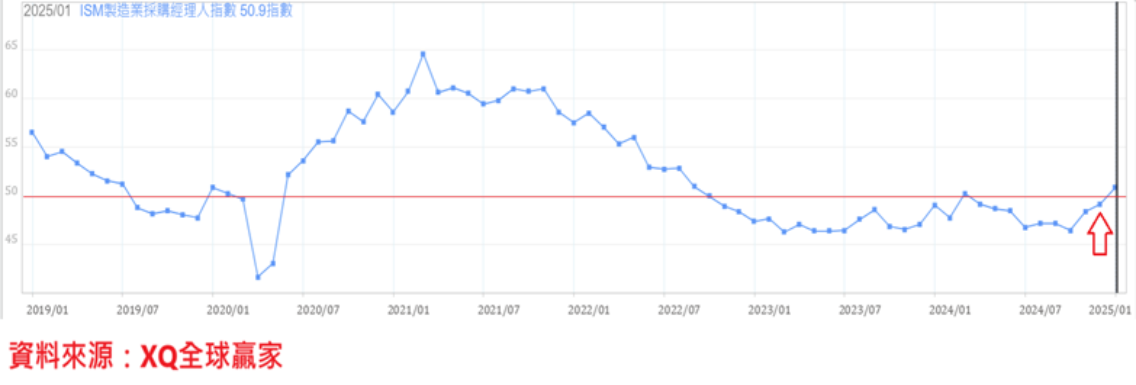 美國1月ISM製造業採購經理人指數自12月的49.2,上升至50.9,連續第3個月反彈,為2022年9月後最高點,顯示美國製造業景氣出現落底回升徵兆,製造業景氣初步出現復甦現象,美國製造業景氣是否持續脫離超過兩年的景氣收縮期,仍待進一步追蹤印證。對照2024年12月生產者物價指數年增率3.3%,連續3個月上升,並創2023年2月後的最高點,亦顯示上游製造業景氣出現轉強徵兆,通膨升溫的壓力再度上升。