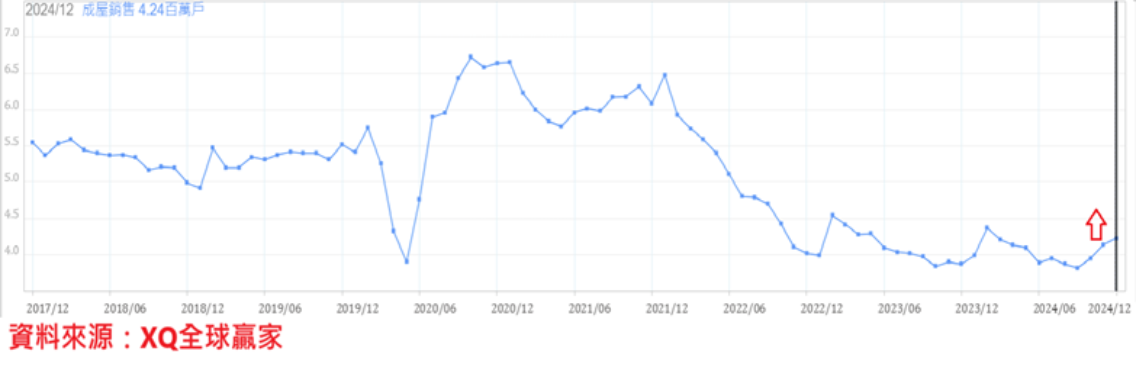 占整體房市成交量約85%的美國12月成屋銷售年率戶數,連續3個月反彈至424萬戶,月增2.2%,年增9.3%,9月創2010年10月後最低點後,10月、11月、12月連續小幅反彈,年增率連續37個月呈現衰退後,連續3個月轉正成長。12月成屋房價中位數40.44萬美元,與11月持平,2024年6月創下42.69萬美元,累積跌幅4.87%,房價依舊在長期高檔區,成交量雖連續3個月小幅反彈,但仍在長期低檔區、交易冷清。