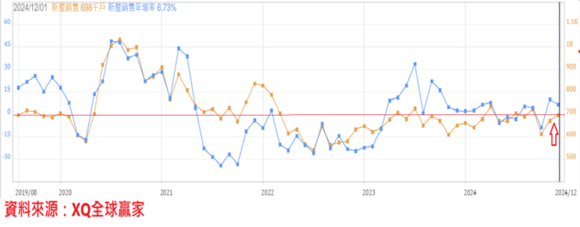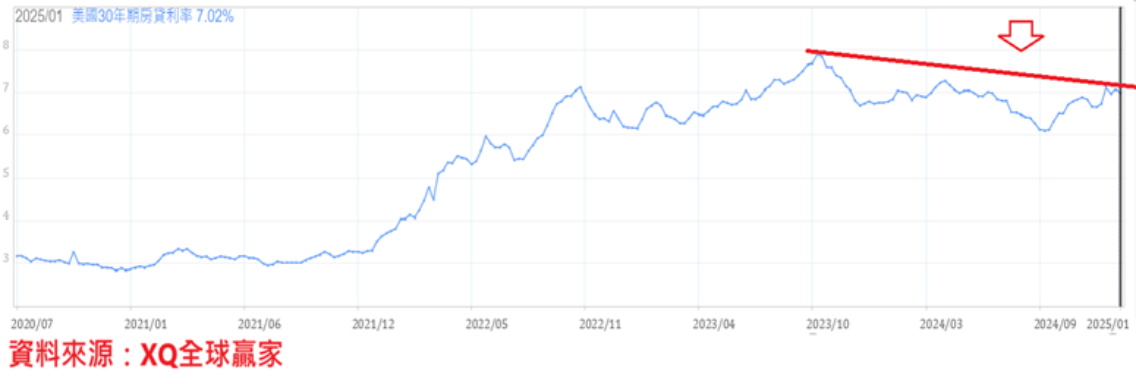 2023年10月美國30年房貸利率最高點7.9%,2023年底降至6.71%,2024年4月一度反彈至7.29%,隨長年期公債殖利率自高檔滑落,30年房貸利率9月中下旬進一步下降至6.13%,創2022年9月後最低點,顯示銷售量陷入長期低迷的房市,導致代表長年期資金需求的房貸需求持續萎縮。2024年10月上旬受美國長年期公債殖利率快速反彈,30年期房貸利率12月下旬反彈至7.13%,創2024年5月後最高點,1月下旬小幅回落至7.02%。