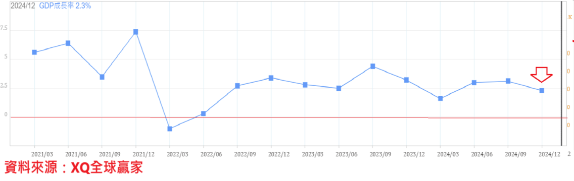 美國2024年第四季GDP季增年率2.3%,低於經濟學家預測值的2.5%,亦較第三季的3.1%趨緩,2024年全年經濟成長年增率2.8%,稍低於2023年的2.9%,整體經濟景氣擴張力道僅維持平穩,但仍在穩定擴張的軌道之中。