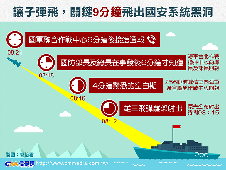 因為檢方公布的飛彈發射關鍵時間點曝光,國防部4日送抵立法院的報告,就把飛彈發射時間點更正為早上8點12分。但更令人不解的是,如果雄三飛彈8點12分離架,為何到8點16分才由位於水星碼頭的海軍第256戰隊值日官通報出事了,這段長達4到5分鐘的空窗期,戰情回報失靈之外,戰管也沒同步監控到嗎?