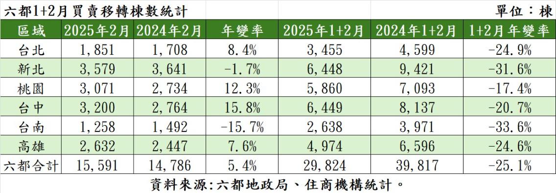 綜觀六都地政局資料,台北市2月買賣移轉棟數為1,851棟, 1+2月買賣移轉棟數為3,455棟,年減24.9%;新北市2月買賣移轉棟數為3,579棟,1+2月共達6,448棟,年減31.6%;桃園市2月買賣移轉棟數為3,071棟, 1+2月約5,860棟,年減17.4%;台中市2月買賣移轉棟數為3,200棟,1+2月共6,449棟,年減20.7%;台南市買賣移轉棟數為1,258棟,1+2月2,638棟,年減33.6%;高雄市買賣移轉棟數為2,632棟,1+2月共4,974棟、年減24.6%;六都總計2月買賣移轉棟數為15,591棟,1+2月共29,824棟,年減25.1%。