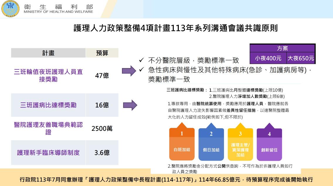 她也提到,去年受限於經費,發放的夜班津貼對象只有一般急性病床,今年會擴大所有特殊病床,不分醫院層級的奬勵標準會一致,急性病床與慢性及其他特殊病床,包括急診、加護病房等,提供小夜新台幣400元、大夜650元的津貼,讓護理人員都能拿到一樣的獎勵。