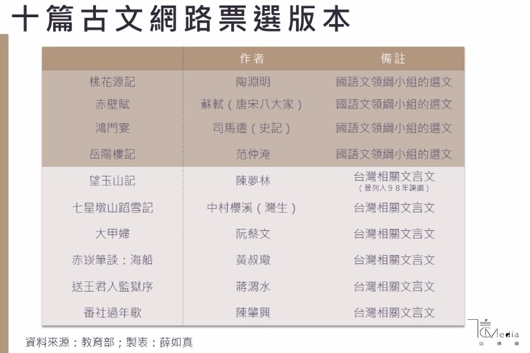 18日教改論壇曾召開記者會,反對課審會有意將高中推薦選文中的文言文由20篇降為10篇,甚至開放網路票選高中課本選文,凌駕國文領綱小組的專業意見。北一女中國文老師段心儀表示,現行的10則網路票選版本中,僅有4篇是國語文領綱小組的選文,其餘六篇皆是與台灣相關的文言文。