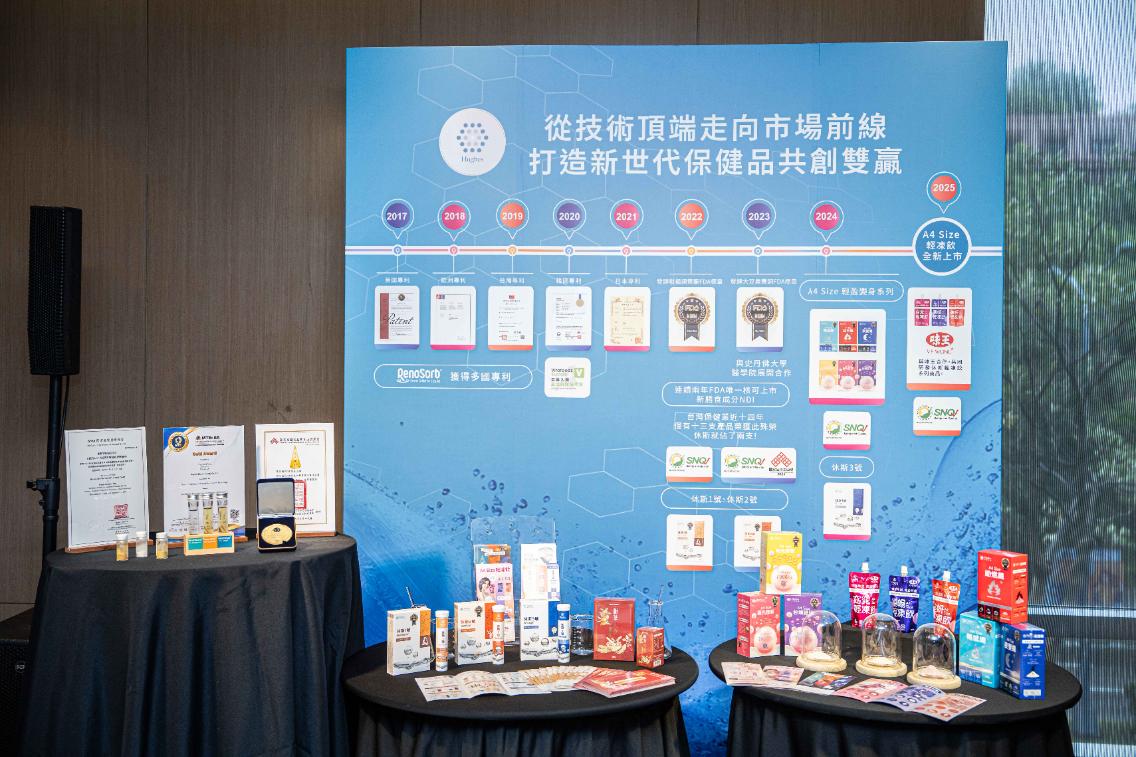 休斯生醫與味王技術聯手「A4 Size輕凍飲」美麗有感全通路上市在保健食品選擇眾多的台灣市場,健康補充品不僅要安全無虞,更要求有效率吸收,休斯將食品安全提升到營養機能科技的新層次,前立法院長王金平於記者會上表示:「休斯生醫連續三年獲得 SNQ 國家品質標章,不僅顯示其產品的卓越品質,也象徵著台灣生技產業在全球市場的競爭力。」