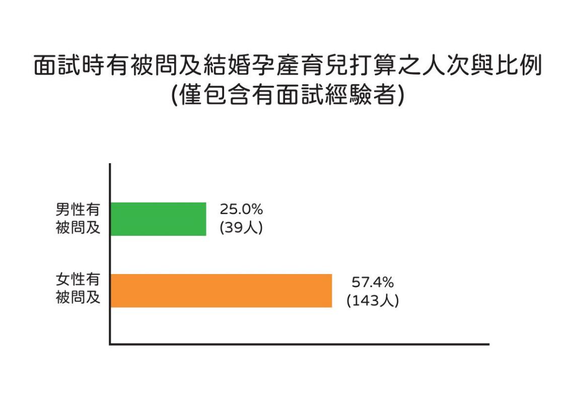 工會發現,在擁有面試經驗的受訪者中,有57.4%的女性曾被詢問過關於結婚或孕產育兒打算的問題,而男性僅有25.0%。整體來說,女性在面試時遭遇此類問題的可能性是男性的4.05倍。2017年曾有調查指出,44.16%女醫師曾遇到類似提問,工會直指這凸顯了該問題越發嚴重。
