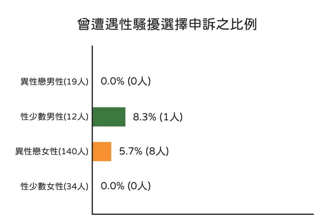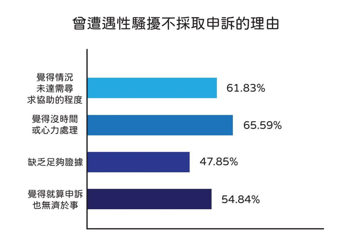 工會的研究發現,異性戀男性無人選擇申訴(0.0%),而位處性騷熱區的異性戀女性的申訴比例僅為可憐的5.7%。最常見不採取申訴的理由包括:「覺得情況未達需尋求協助的程度」(61.83%)與「覺得沒時間或心力處理」(65.59%)。此外,「缺乏足夠證據」(47.85%)和「覺得就算申訴也無濟於事」(54.84%)也是重要因素。