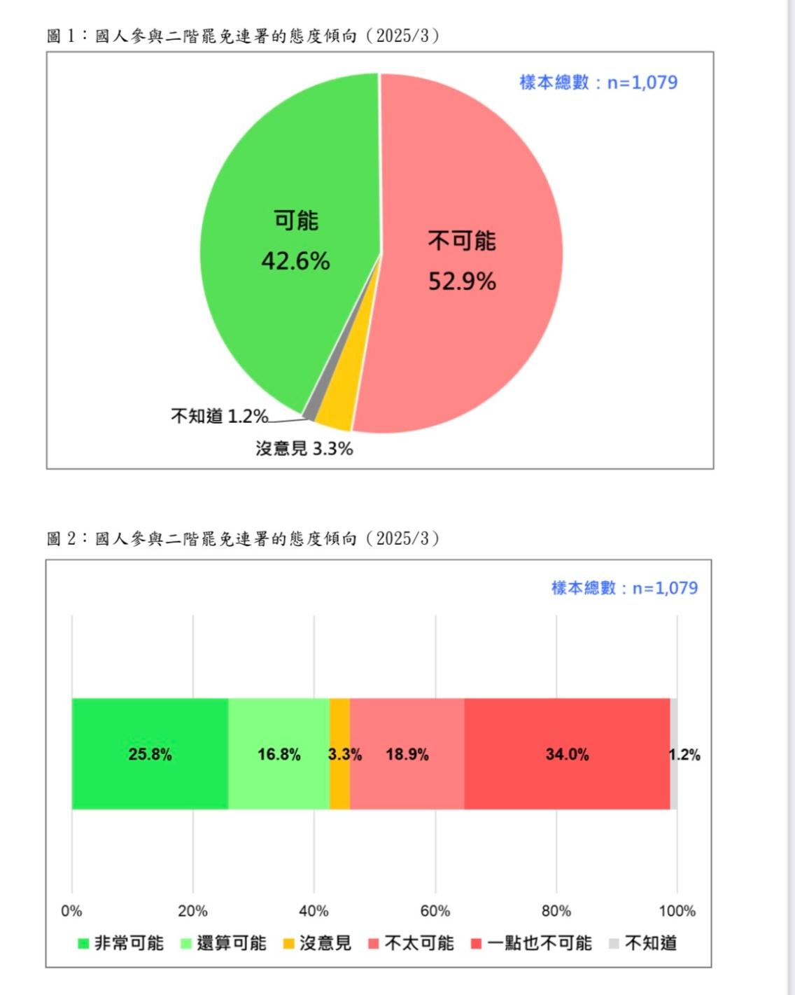 針對「若您是選區選民,會不會參與二階罷免連署?」的提問,25.8%表示非常可能、16.8%還算可能、18.9%不太可能、34%一點也不可能,另有4.5%無意見或不知道。整體而言,43%可能參與、53%不可能,顯示二階連署通過的可能性正在上升。