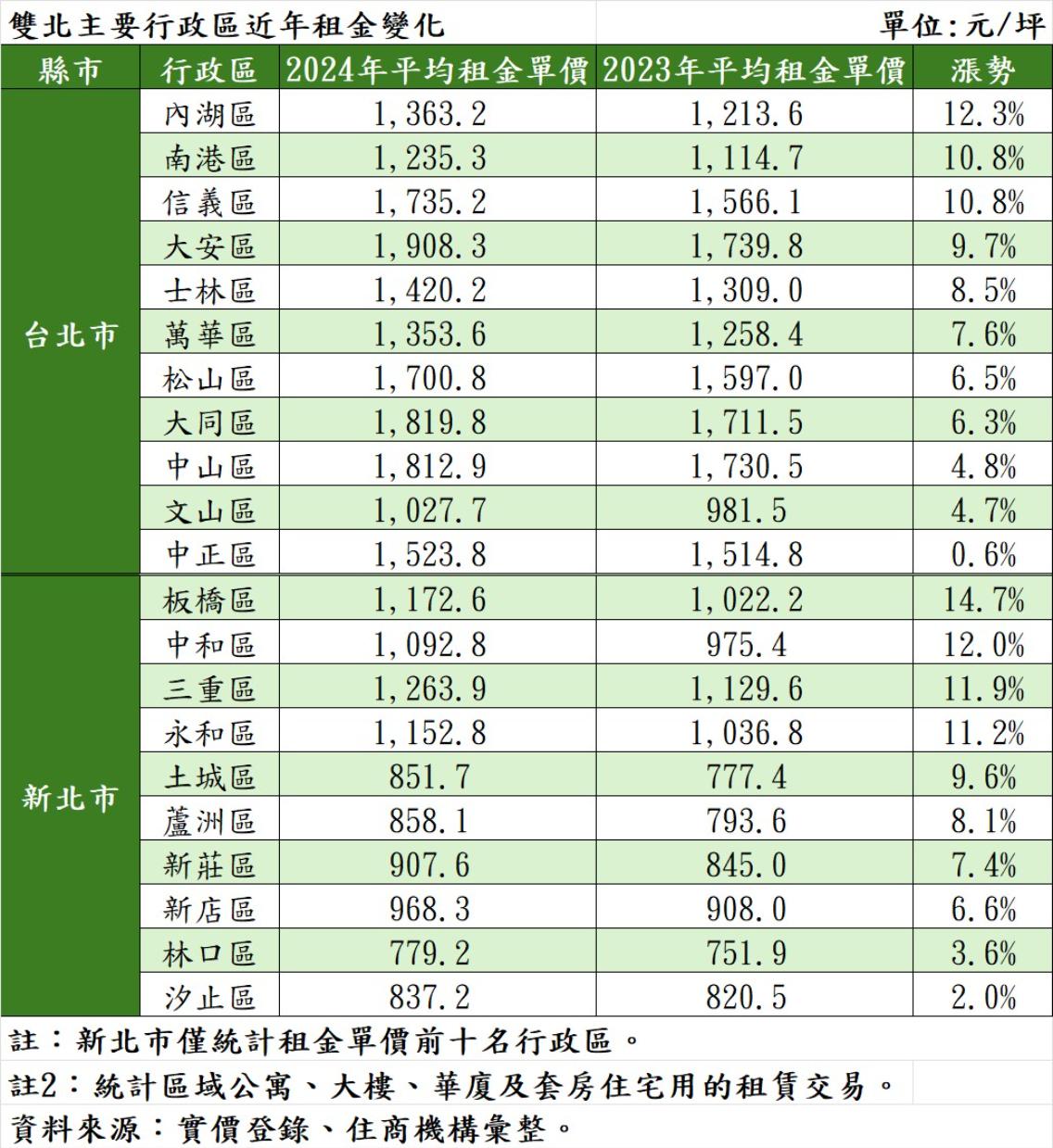 住商機構根據實價登錄資料,觀察台北市、新北市主要各行政區2024年平均租賃行情。統計顯示,台北市以內湖、南港以及信義區名列租賃行情漲幅的前三名,漲勢皆突破一成。賴志昶分析,內湖、南港兩處由於科技產業園區加持,為在地提供穩定的產業人口,讓當地租賃市場相當蓬勃,區域租金漲勢亦日益明顯;至於信義區本身為北市甚至全台房價數一數二高的區域,地區商業機能成熟,加上房價易漲難跌,在房市熱度明顯之下,沒有讓房東有租金降價空間。
