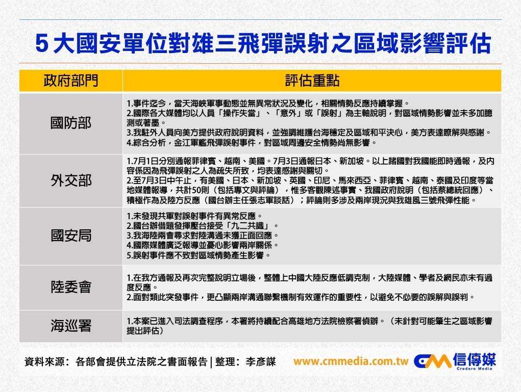經過誤射飛彈的72小時「驚恐」,期間國防部也多次召開記者會,或駁斥有關「戰爭論」的不實傳言,然而,這一場委員會,可說是政府5大國安系統最新且最具權威的一次共同報告。