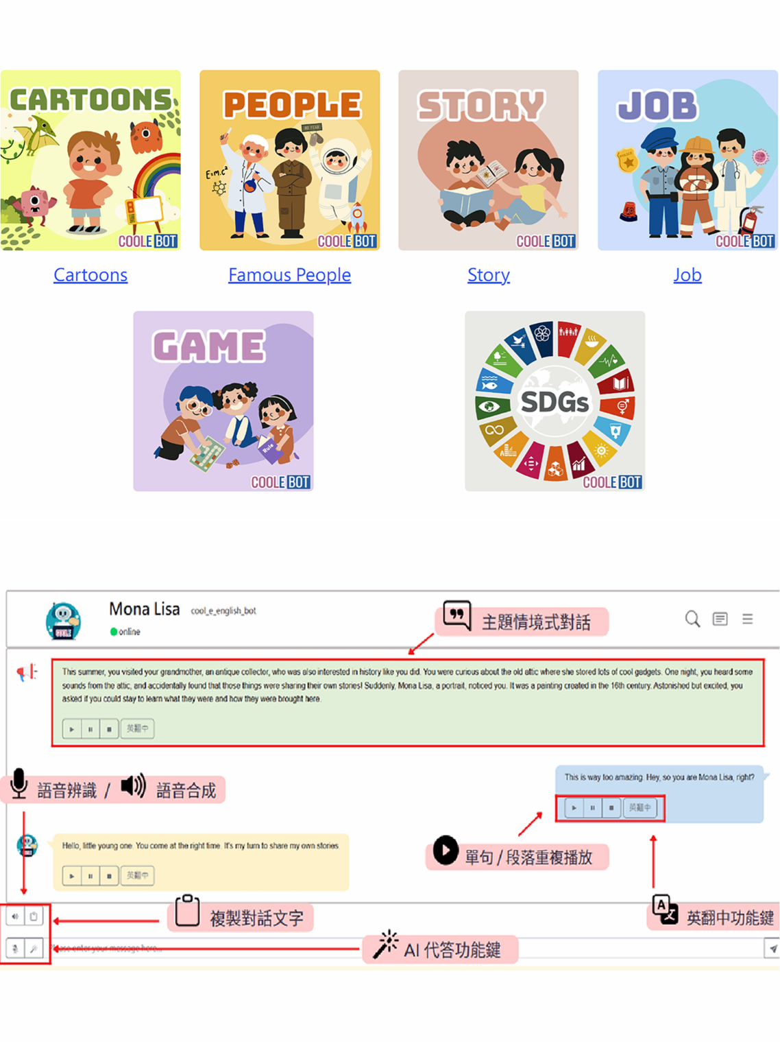 他說:「智慧型助理有能力透過語音識別和處理我們的語言,和我們進行更流利的互動。簡單來說,它們能懂你說什麼,還能回答你的問題或幫助你完成任務。因為這項技術,它們可以成為學習語言的好幫手。」。 2023年初酷英網開發結合 ChatGPT 語音辨識、語音合成的各式英語聊天機器人 CoolE Bots,其中包含卡通人物,世界名人,故事,遊戲等等語言庫,全年無休服務全國學生。