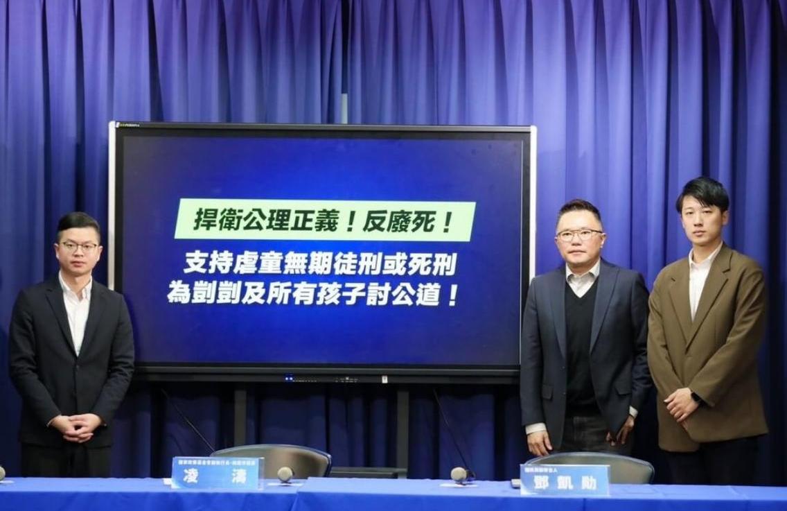 國民黨台北市議員張斯綱、桃園市議員凌濤、國民黨副發言人鄧凱勛等人,今天在國民黨中央黨部召開「捍衛公理正義!反廢死,支持虐童無期徒刑或死刑,為剴剴及所有孩子討公道!」記者會。