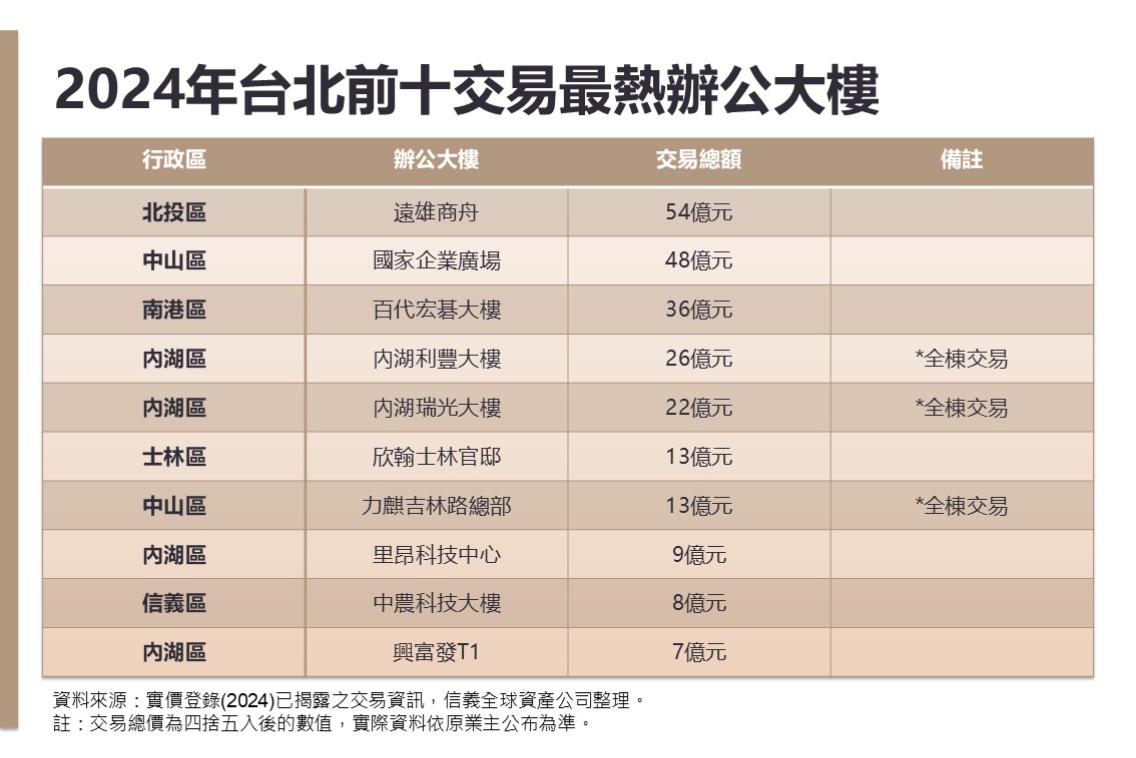 信義全球資產公司據實價登錄已揭露之辦公大樓交易額,整理2024年十大交易最熱門辦公大樓,前兩名均由辦公預售案拿下。第一名為位於北投的「遠雄商舟」,挾北士科產業發展題材,吸引美商捷寶開發、兆芃國際投資、凌群開發等上市櫃企業布局,去年累計成交金額達54億元;第二名是中山區「國家企業廣場」,交易額達48億元,其中高樓層戶成交單價來到每坪180萬,刷新去年預售辦公單價最高紀錄。