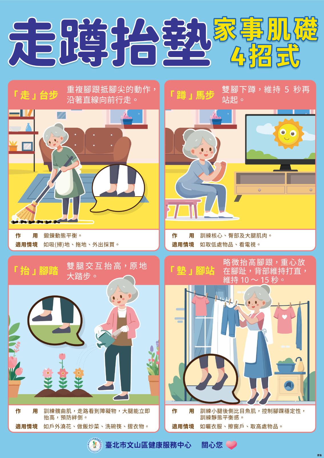 文山區健康服務中心主任陳幸宜表示,除了強調規律的運動訓練外,本中心特別推出了一項針對長者的「家事肌礎」4招式(附件2),幫助長者在日常家事中輕鬆進行肌力與平衡的鍛煉。這四個簡單易行的動作包括走台步、蹲馬步、抬腳踏與墊腳站,透過日常掃地、拖地、洗碗等家務活動,長者能夠有效地加強腿部肌肉、提升核心穩定性,同時訓練平衡能力,進一步達到防跌效果。陳幸宜指出,這些動作可以將運動與日常生活結合,讓長輩在不知不覺中進行肌力訓練,實現既方便又有效的健康管理,進而提高生活品質,讓長者變得像不倒翁一樣快樂而穩定。