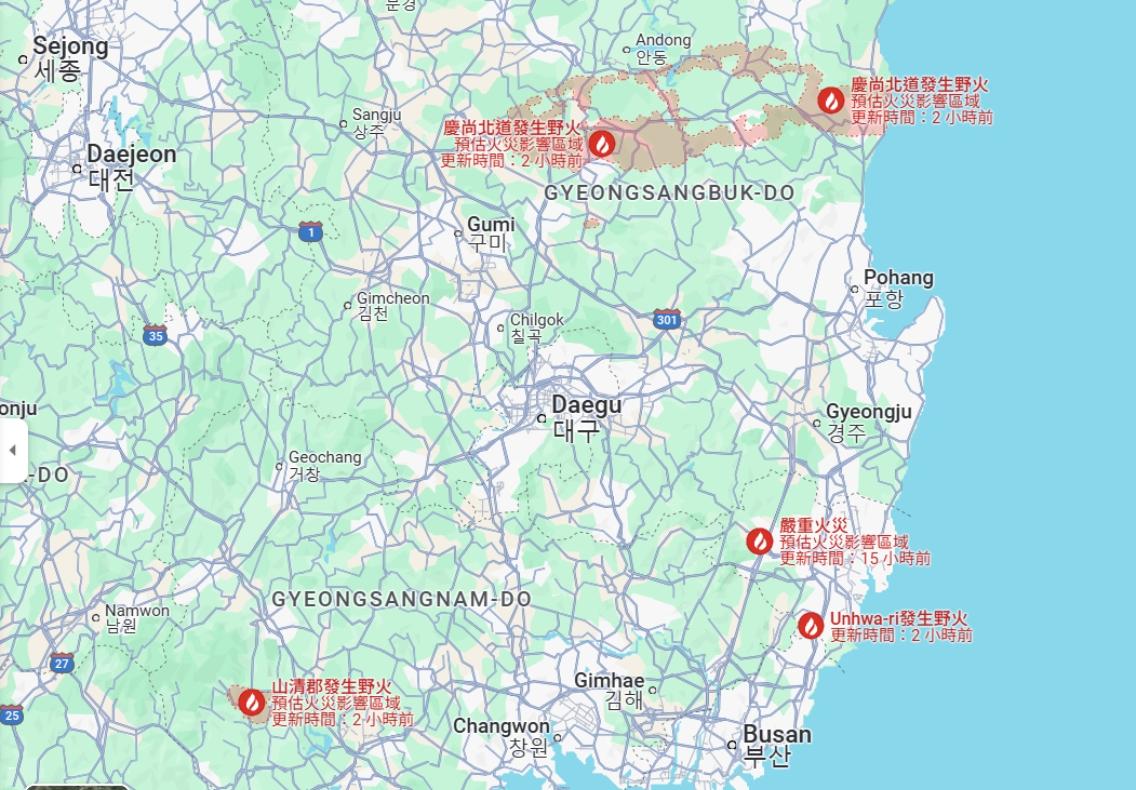 值得注意的是,這場大火已吞噬多處文化資產,包括位於義安郡的千年古蹟雲羅寺,在僧侶的搶救之下,才勉強保住幾件珍貴的佛教聖物;而由於火勢一路向東延燒,也一度危及監獄,火勢一度位於青松的慶北北部第2監獄,所幸有控制住火勢並,順利移送監獄內約500人的重刑犯。