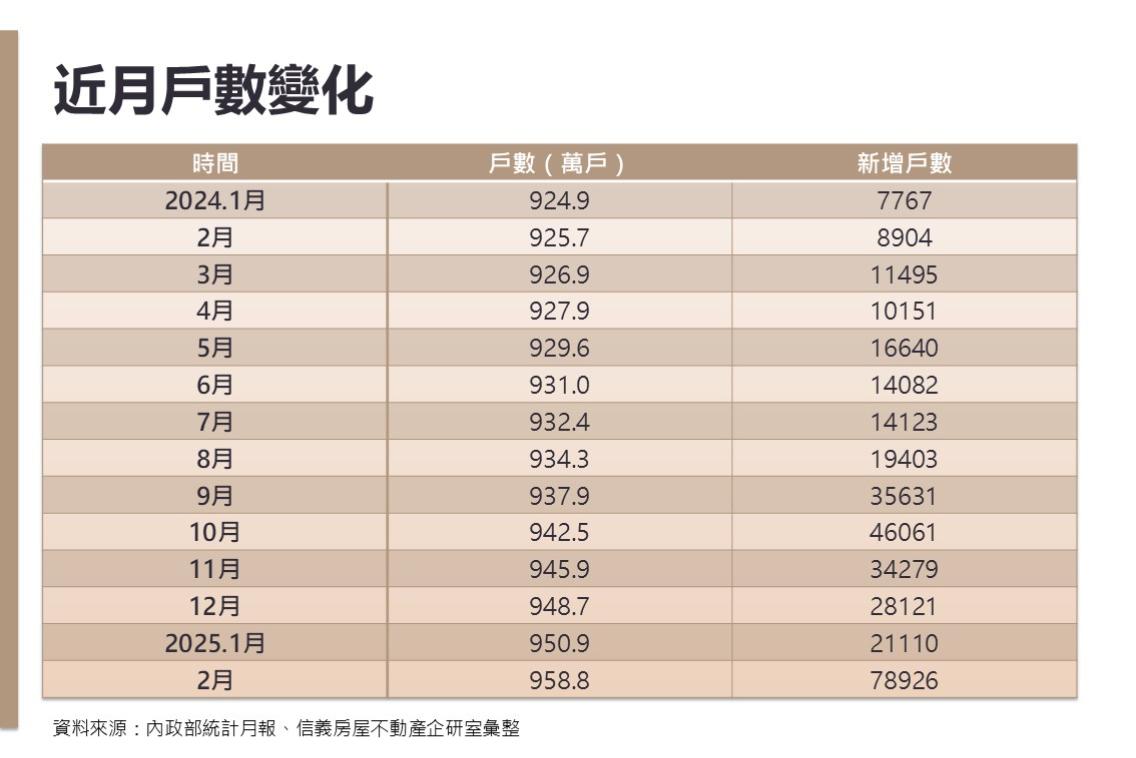 統計顯示,今年2月戶口數量呈現暴衝,較上月大增7.9萬戶,前兩月戶數增加約10萬戶,尤其從去年9月開始就以每月新增2.8萬戶~4.6萬戶的速度快速增加,但在2013~2022年間平均一年新增戶數僅約9萬戶。
