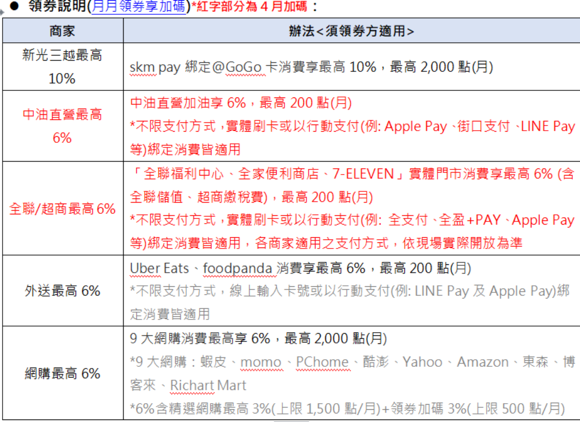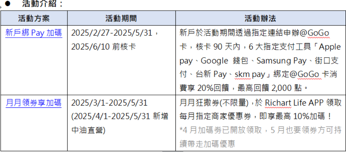 除了4月全新加碼,@GoGo 卡於5月底前推出兩大活動,新戶和卡友都能輕鬆參與。活動一、新戶透過指定連結申辦@GoGo卡,核卡90天內於Apple Pay、Google 錢包、Samsung Pay、街口支付、台新Pay、skm pay 6大支付工具綁定消費,可享最高20%回饋,最多可獲得2,000點;活動二、超過100萬黑狗卡友只要月月透過 Richart Life APP 領券,在中油直營站(4月新增)、新光三越、全聯、兩大超商(7-ELEVEN、全家)、兩大外送(Uber Eats、foodpanda)、9大網購(蝦皮、momo、PChome、酷澎等)消費,最高可再享10%回饋,領券不限量,人人有獎!