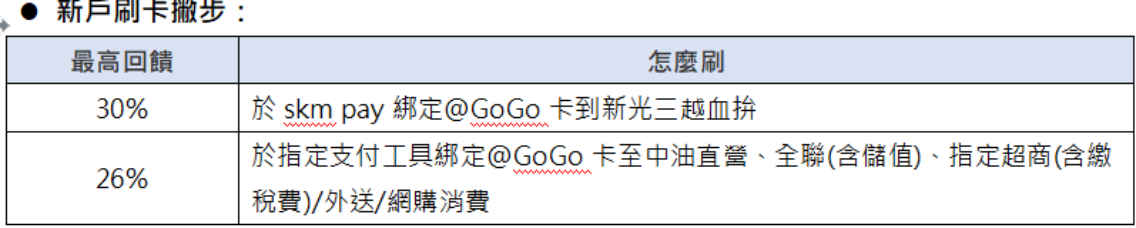 台新為回饋卡友,公開刷卡Combo小撇步,新戶透過skm pay綁定@GoGo卡,在新光三越消費可享最高30%回饋。趁現在申辦@GoGo卡,享受生日慶加碼優惠,省錢無痛搶搭這波回饋熱潮!