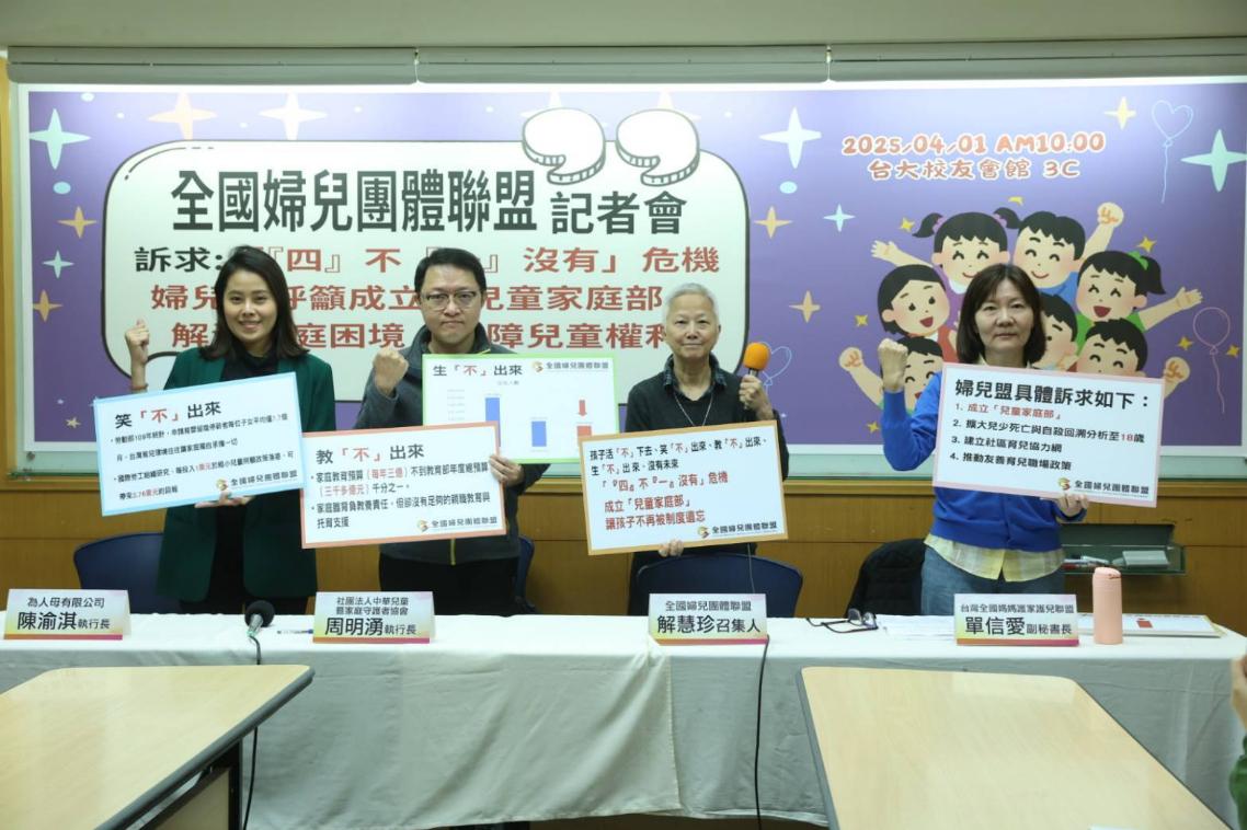 4月4日是兒童節,全國婦兒團體聯盟(婦兒盟)指出台灣正面臨「4不1沒有」危機,即「孩子活不下去、笑不出來、教不出來、生不出來、沒有未來」。