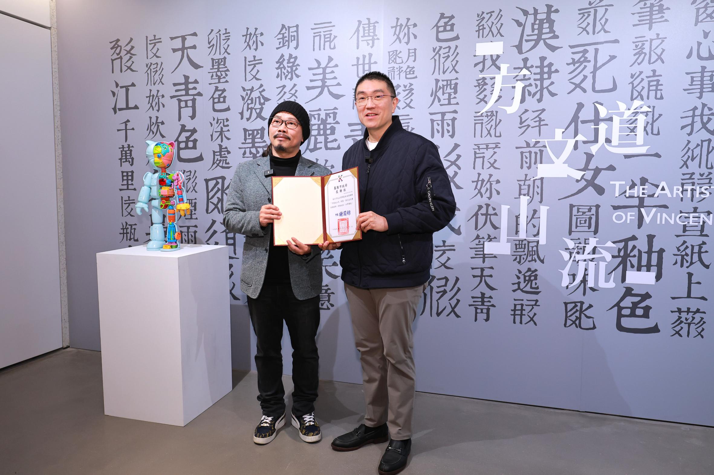 謝國樑高度肯定《方道文山流》在文字藝術、公仔設計與視覺風格探索上的多元呈現,同時也表示方文山老師的展覽在基隆引起廣泛迴響及討論,感謝方老師願意來到基隆辦理個展,與基隆的市民朋友分享獨特藝術。
