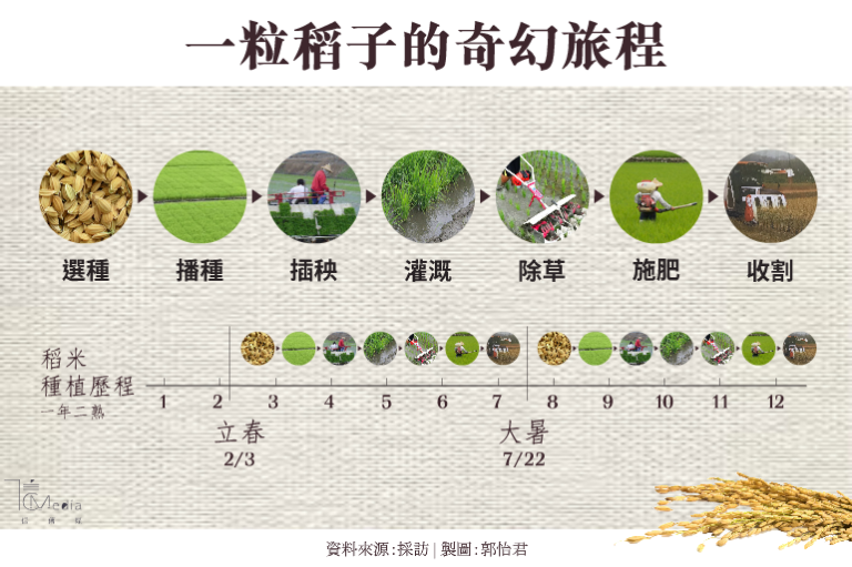 一輩子與稻米為伍,就某種角度來看,也是一件很浪漫的事。從整地、淹水、插秧、施肥、除草,到稻禾結穗隨風搖曳,然後收割、烘乾、碾米……光是一粒稻子,就要經過如此繁複的工序和漫長的守候,而他40幾年來如一日,日出而作,日落而息,心心念念守著那一片稻田。
