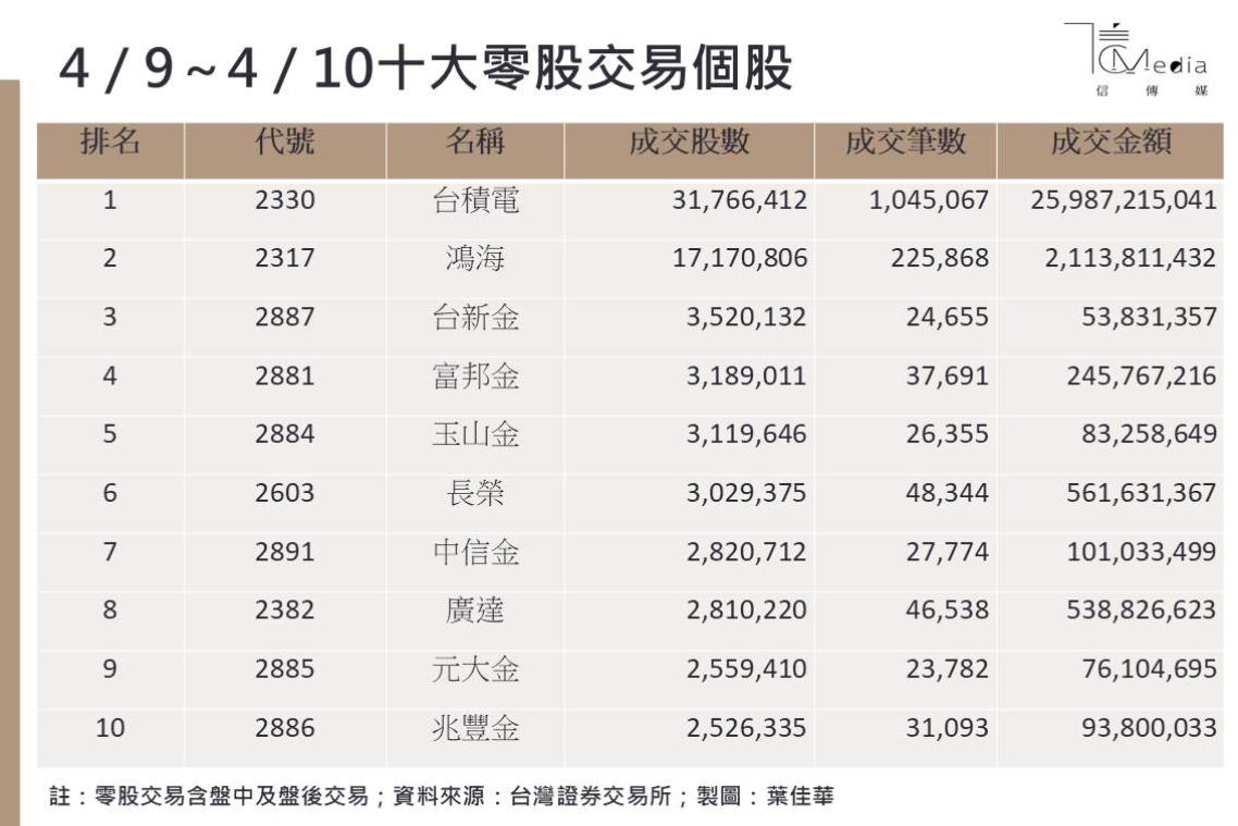 根據台灣證交所每日公布的盤中及盤後零股交易概況,統計4月7日至10日為止,在個股方面,其中,權王台積電因股價一度曾跌出800元大關以下,使得散戶趁機搶進,累計周一至周四,四天盤中及盤後零股成交量已達到3176萬6412股,成為零股交易之冠,成交金額逼近260億元;且從這四天的表現來看,頗有股價越跌、散戶越檢的跡象。