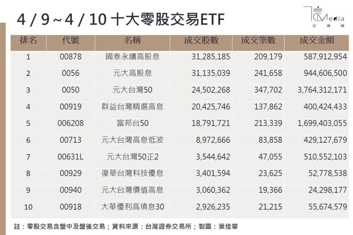 ETF部分,零股投資人也搶進布局有「國民ETF」之稱的國泰永續高股息(00878),累計四天成交股數達3128萬5185股,拿下ETF居冠;其次是元大高股息(0056),成交股數也高達3113萬5039股,分別包辦零股交易ETF前兩名。