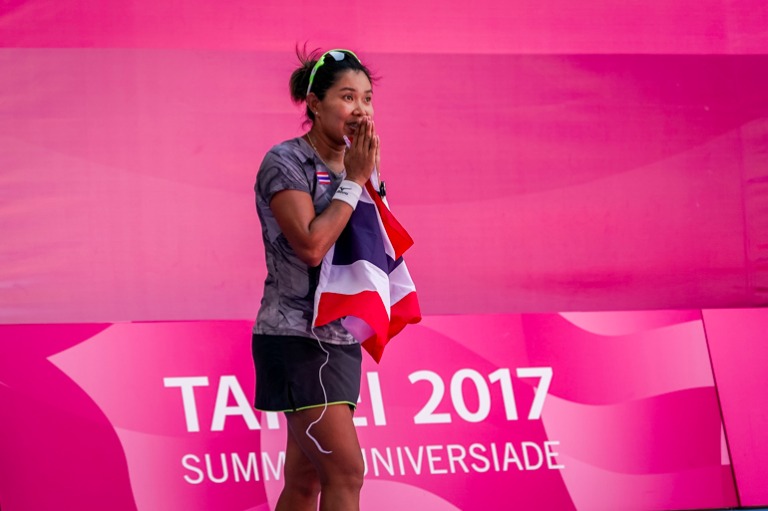 泰國選手Wongteanchai Varatchaya贏得金牌,開心地拿出國旗。