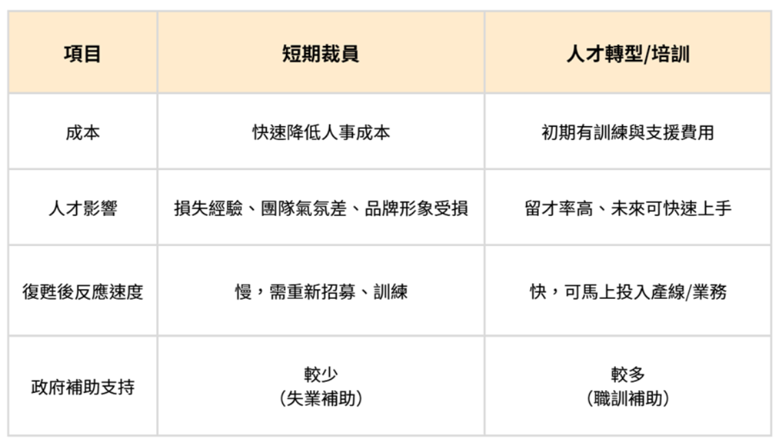 行政院已祭出880億元支持方案,待行政院院會通過特別條例草案後,送立法院審議。許多企業容易忽略政府現有的人才發展資源,如「產業人才投資方案」、「中高齡及高齡就業促進計畫」等,皆提供訓練或薪資補貼,協助企業人事調整壓力的同時,也能提升員工效能。建議企業將補助方案納入企業營運資源,模擬「不裁員並導入補助」是否仍可維持營運,幫助決策者理性判斷重要決策。