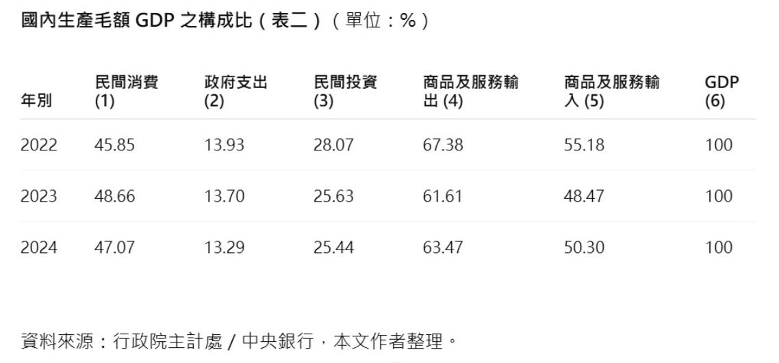 以過去三年GDP的構成來說(如表二),廣義的內需,民間消費+政府支出+民間投資,即佔了GDP的87.2%(三年平均),淨出口(輸出減輸入)僅占了12.8%。可見帶動台灣經濟成長的出口產業,雖然產值佔了GDP的64.15%(三年平均),但是由於大量進口的需求,沖銷了龐大的出口數字,使得結構沒有失衡,同時也如前所述,帶動了民間內需(民間消費、政府支出及民間投資)。因此形成了一個非常健康的海島型經濟體系。