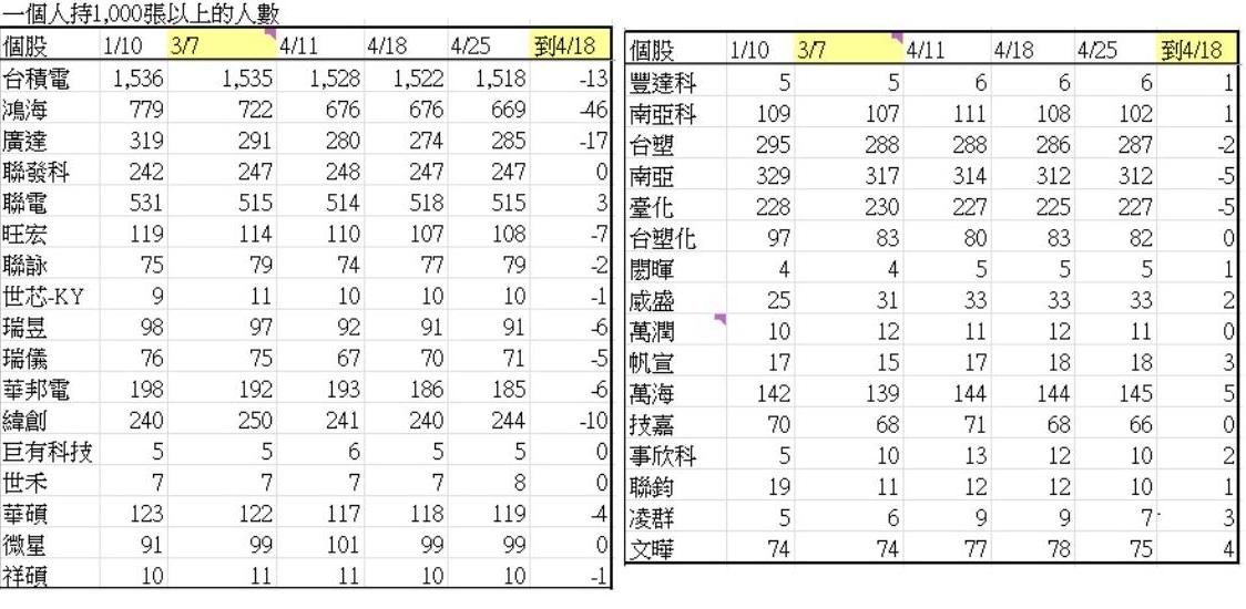 相較於台積電、鴻海,聯發科的持股1千張以上大股東較有把握,從台積電還在1000元價位時的247人,到發生股災、到4月25日當周,仍然維持247人。這247人裡面有人持有好幾千張,例如董事長蔡明介個人持股4萬多張,一張都沒賣。值得一提的是,聯發科不但持股千張以上大戶沒有減少,持股800到1000張的大股東在這一波股災後,竟然比3月7日時還新增3人。