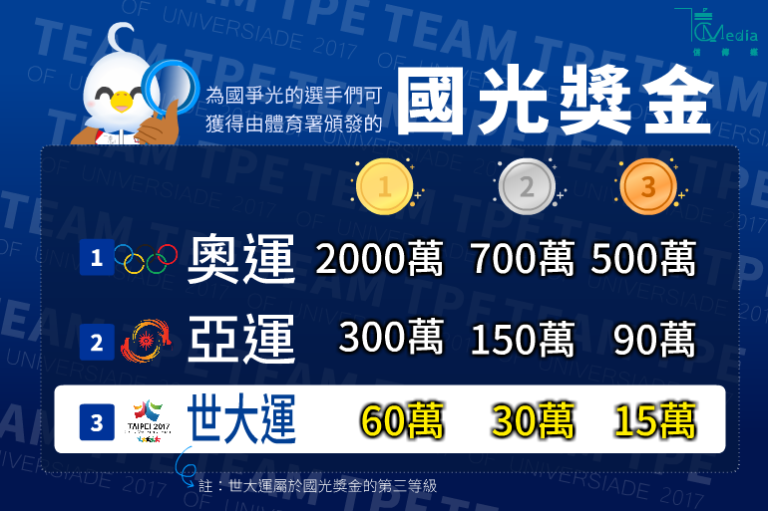 本屆世大運台灣隊勇奪26金34銀30銅的史上最佳成績,獲頒發的國光獎金近億元獎金。(圖文設計/郭怡君)