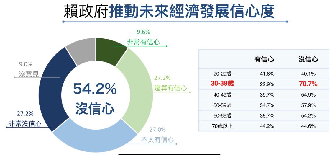 對賴政府推動未來經濟發展的信心度不足。整體有54.2%民眾表示「沒信心」,僅36.8%表示有信心。其中30至39歲族群中,70.7%無信心,僅22.9%表示有信心。