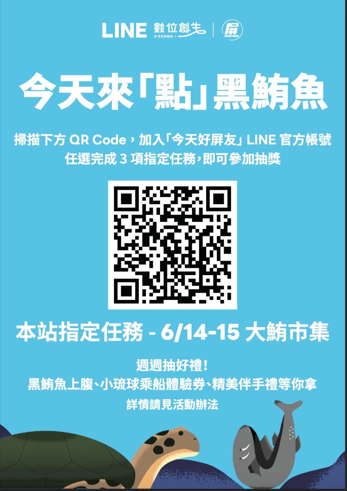 縣府指出,這次「今天來點黑鮪魚」集點任務,民眾須先加入「今天好屏友」LINE官方帳號,完成行程配對測驗後獲得推薦主題路線,包括東港一日遊、港邊慢活路線、港島路線、瘋玩小琉球等4路線,以打卡、拍照、店家加好友等方式進行闖關。