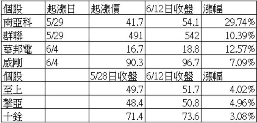 資本市場反應很快,5月29日南亞科起漲,到12日收盤54.1元已經上漲近3成,有29.7%的漲幅,同一段期間群聯也有10%的漲幅,12日收盤542元。華邦電起漲點則是晚一點,6月3日之後開始上揚,以12日收盤18.8元計算,也有12.57%的漲幅,威剛12日股價下跌,收在96.7元,但起漲點和華邦電一樣,這樣算下來亦有7%漲幅。
